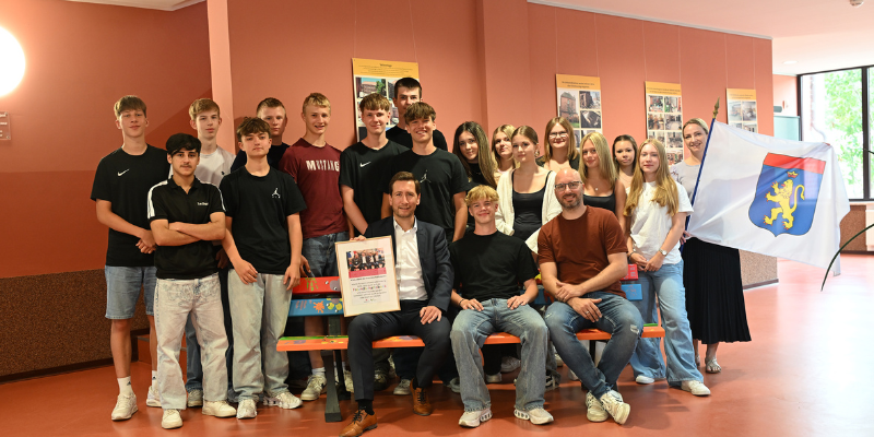 Heute Vormittag übergab Halberstadts Oberbürgermeister Daniel Szarata gemeinsam mit Stadtmarketingleiterin Nancy Wesemeier, zuständig für Städtepartnerschaften, die Bank an Schulleiter Björn Ahlsleben. Mit dabei waren Schülerinnen und Schüler der neunten Klassen.