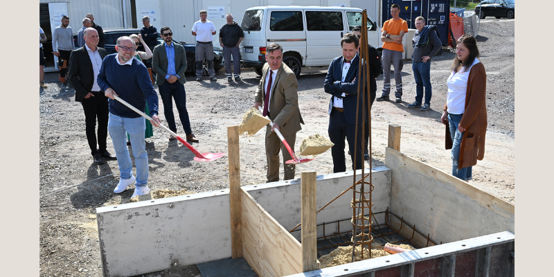 Die Grundstein-Zeremonie fand im Beisein von Landrat Thomas Balcerowski und Oberbürgermeister Daniel Szarata sowie Wirtschaftsförderer Thomas Rimpler und weiteren Vertretern aus der Politik und Verwaltung, von den am Bau Beteiligten und von Seiten des Betreibers und des Bauherrn statt.