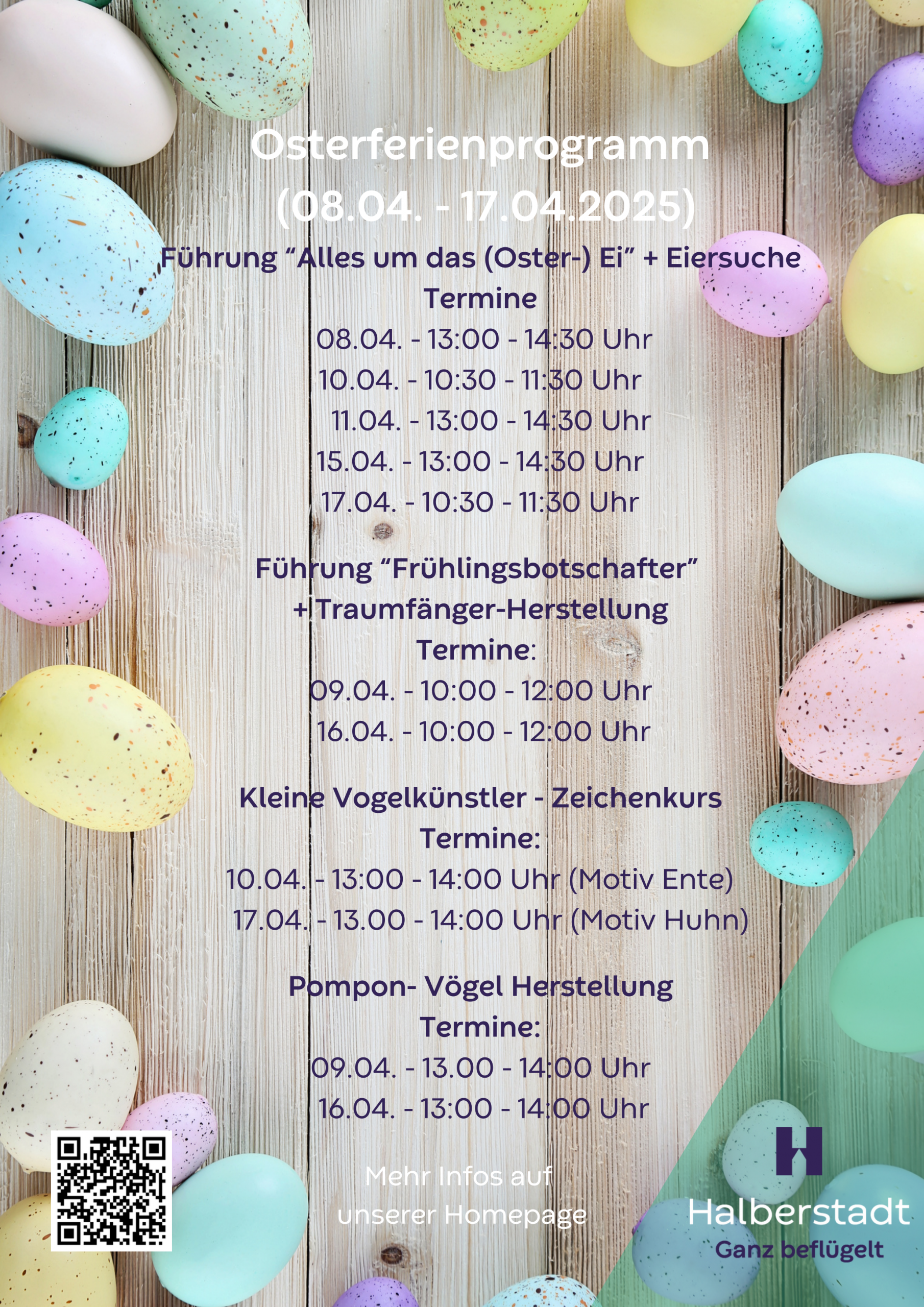 Führung „Alles um das (Oster)-Ei“: In dieser besonderen Osterführung dreht sich alles um das Ei! Die Teilnehmer erfahren, wie ein Ei entsteht, welche Unterschiede es zwischen Vogeleiern gibt und welche besondere Rolle Eier zu Ostern spielen. Zudem werfen wir einen Blick auf spannende Osterbräuche rund um das Ei. Eine lehrreiche und unterhaltsame Führung für die ganze Familie!
