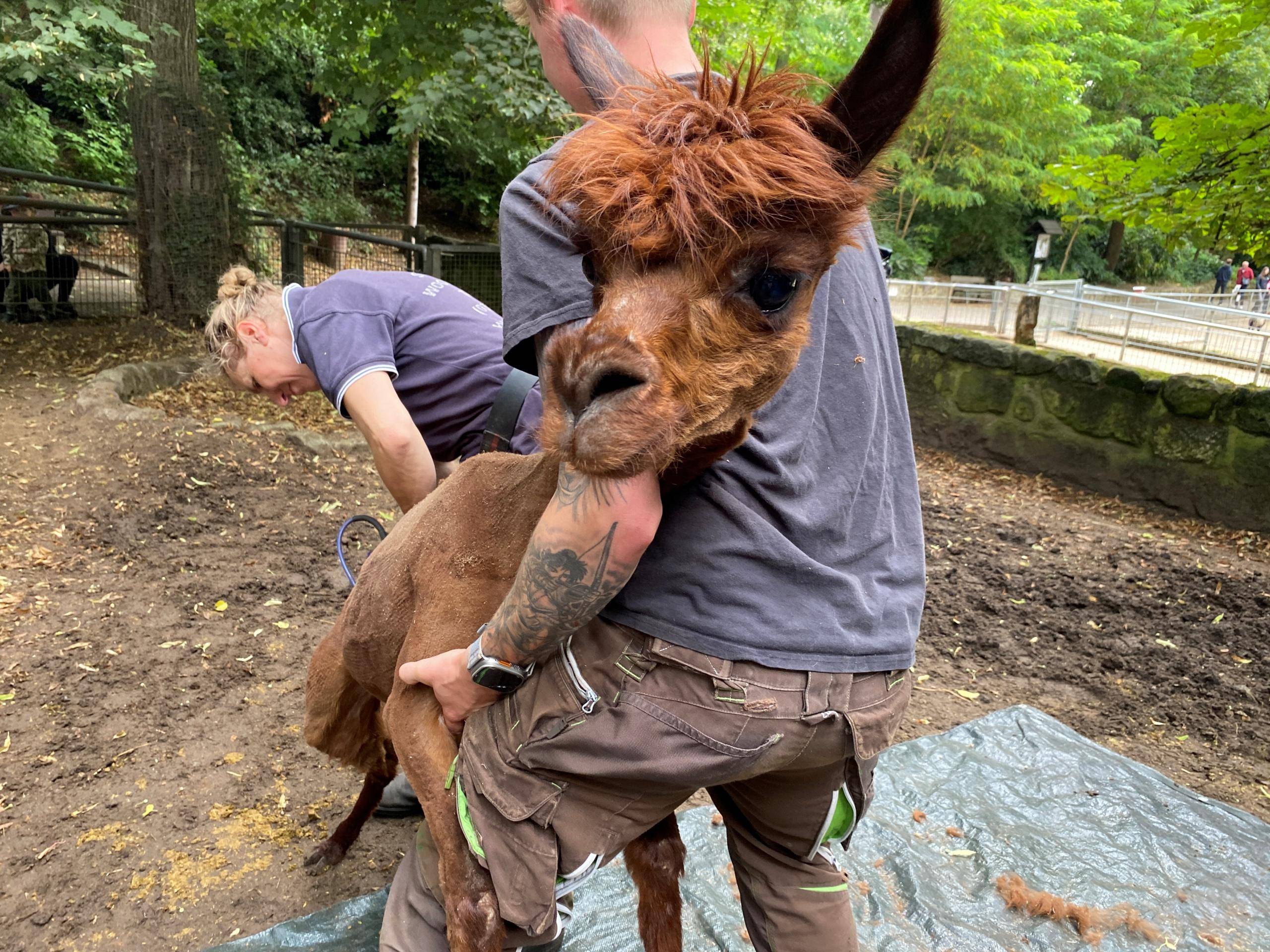 „Die Alpakas werden für die Wollproduktion gezüchtet und verlieren ihre Wolle nicht von selbst“, erläutert Tierpfleger Florian Hartmann. „Damit sie die Hitze im Sommer gut überstehen, geht es einmal im Jahr zum Friseur.“