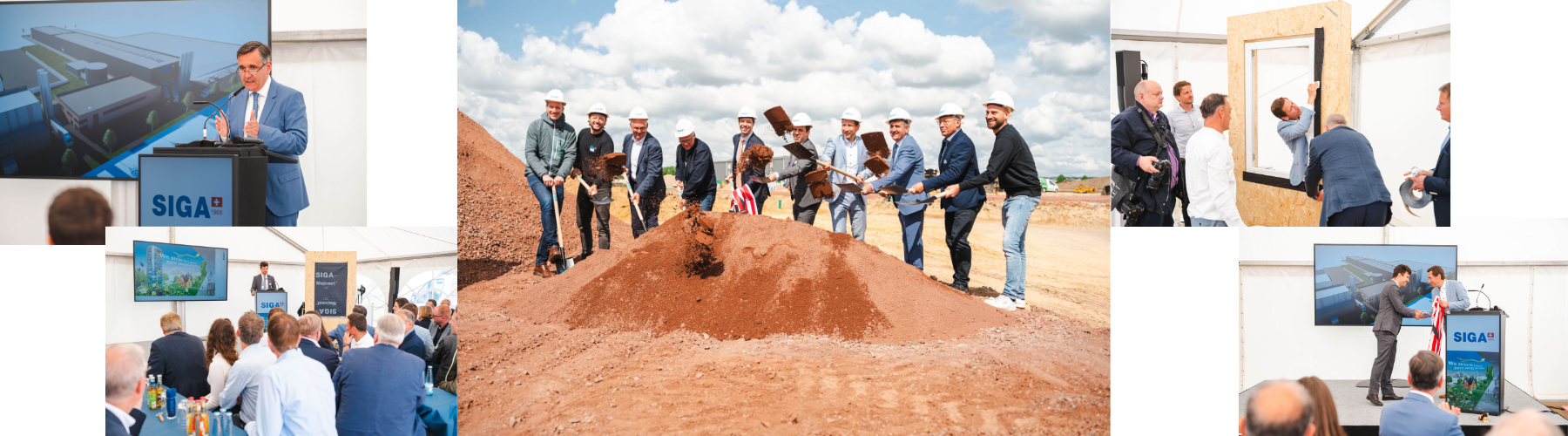7. Mai, zum offiziellen Spatenstich zahlreiche Vertreter aus Politik und Wirtschaft willkommen heißen. Zu den Ehrengästen zählte unter anderem Thomas Balcerowski, Landrat des Landkreises Harz. Er äußerte seine Freude darüber, dass sich mit SIGA in Halberstadt ein Unternehmen ansiedelt, dessen „Ideen und Erfindungen den Umweltschutz voranbringen“ und versprach zugleich, die Produkte beim geplanten Ausbau der Gebäude auf dem Brockenplateau zu testen. „Was auf dem windreichen Brocken funktioniert, hält auch im Rest von Deutschland“, sagte er augenzwinkernd. Halberstadts Oberbürgermeister Daniel Szarata schloss sich der Begeisterung an: „Ich bin Fan Ihrer Firma. Für unsere aufstrebende Stadt ist das eine großartige Ansiedlung, die attraktive Arbeitsplätze schafft.“ Als Willkommensgeste und Zeichen freundschaftlicher Verbundenheit überreichte der Oberbürgermeister eine Fahne der Stadt, deren Farben Rot und Weiß zur Schweizer Flagge passen. „Da muss niemand Heimweh bekommen.“