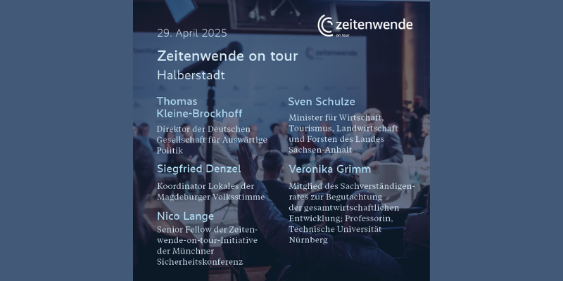 Zu den Gesprächspartnern zählen unter anderem Sven Schulze, Minister für Wirtschaft, Tourismus, Landwirtschaft und Forsten des Landes Sachsen-Anhalt, Veronika Grimm, Mitglied des Sachverständigenrats zur Begutachtung der gesamtwirtschaftlichen Entwicklung und Professorin an der TU Nürnberg, sowie Thomas Kleine-Brockhoff, Direktor der Deutschen Gesellschaft für Auswärtige Politik (DGAP). Ebenfalls mit dabei: Siegfried Denzel von der Magdeburger Volksstimme und Nico Lange, Senior Fellow der Münchner Sicherheitskonferenz.